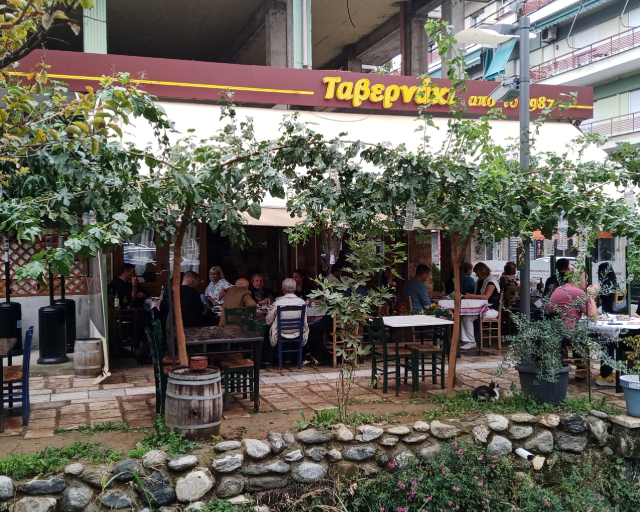 Eine traditionelle Taverne direkt neben dem alten Bahnhof von Agras – umgeben von Obst- und Kirschbäumen, in denen die berühmten Früchte der Region wachsen. Gleich vor der Terrasse verlaufen die Bahngleise, was dem Ort seinen besonderen, nostalgischen Charme verleiht. Hier genießt man frische, hausgemachte Gerichte, gegrilltes Fleisch und Meze in großzügigen Portionen – ganz in der typischen nordgriechischen Atmosphäre.